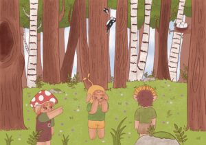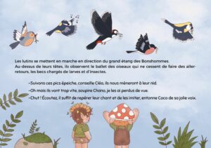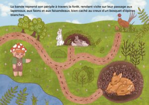 Pour cette deuxième histoire, nous plongeons dans l’univers du printemps en abordant cette renaissance annuelle de la nature (fleurs, feuillage, faune). L’accent est mis sur la naissance des animaux, avec pour objectif d’apporter du vocabulaire aux enfants. Par les illustrations, l’idée est aussi de leur montrer que les robes des pelages ou des plumages ne sont pas identiques entre les nourrissons et les adultes.